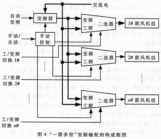 燃气输配主要是维持气源端的压力。压力不足时,逐步加开输配机组,升高压力到设定值;反之,压力过高时,逐步减停机组,降低压力到设定值。由于大功率交流电机反复启停的巨大耗能和器件冲击,所以引入了变频调速器。为进一步降低成本,通常采用一台变频器控制多台交流电机,即所谓的“一器多控”,其机理如下:加压时,变频启动并加速一台电机,达到最大速度时,压力仍没有增上来,则把这台电机转为工频运行,转而对下一台电机