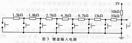 键盘输入,通过一I/O口,由一6位A/D转换器识别。这里选用8个按键,用以实现参数输入、时间核对、记录查询、通信等功能,电路如图3所示。图3所示各个电阻值,据A/D转换特点和常用电阻规格系列确定。