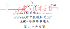 贴片电容由于封装产生了寄生电感和电阻,其等效模型如图2所示。
