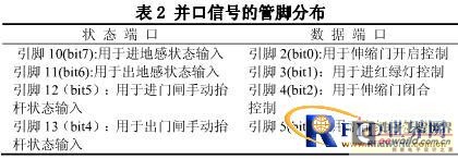 并行端口LPT1 的状态端口379H 进行地感线圈和伸缩电动门闸状态的采集,用数据端口378H 实现电动门闸和红绿灯的开关控制。其中各引脚的分配情况如表2 所示。