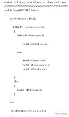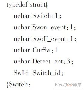 在上述结构体中Switch表示开关信号的当前状态,Swon_event和Swoff_event分别表示开关从断开到闭合和从闭合到断开的变化,CurSw和Detect_cnt用于开关信号采集、的软件消抖功能。设计一10 ms的定时器,周期读取开关当前状态,3次确认以判断Switch、Swon_event、Swoff_event。其代码实现如下: