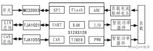 基于S12XS128实现的BCM硬件系统结构如图1所示。由图可见,BCM硬件电路包括开关信号检测、CAN/LIN通讯、负载控制及监控几部分。其中开关信号检测通过多路开关检测芯片MC33993实现,LIN通讯通过UART模块和LIN总线物理层收发器TJA1021共同实现,CAN通讯通过CAN模块和CAN总线物理层收发器TJA1055共同实现,负载控制通过智能功率器件实现,智能功率器件除了实现对负载的功率驱动,还可以提供镜像工作电流,这样通过对其镜像工作电流取样ADC转换便可以监测负载的工作状况。