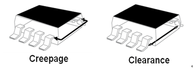 从组件观点来看,隔离器封装尺寸在防止电弧跨越封装表面时非常重要,因此,安全机构规定了特定测试电压下的爬电(creepage)和电气间隙(clearance)距离。如图1,爬电是指沿绝缘表面放电的最小距离,电气间隙(clearance)是指通过空气放电的最短距离。