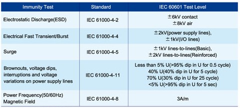 医疗电子系统必须对外部干扰有免疫能力,如来局部磁场、静电,电源线扰动(如线路电压暂降,浪涌和瞬变)。因此,无论是光耦合器还是CMOS隔离器都必须通过IEC - 61000标准。使用测试限度见IEC 60601-1-2规范,如表2所示。例如,静电放电(ESD)需符合IEC 61000-4-2规范,并使用由IEC 60101-1-2规定的测试限度。 RF辐射及电源线扰动测试使用CISPR11测试方法,它是J1750汽车规范的子集。(CISPR不指定测试限度,它是一个测试方法的标准。)对于辐射和电源线敏感性的限制需符合IEC 60601-1-2规范。