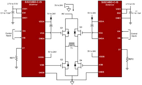 输入端之后是增强型双通道数字隔离器,其输出连接到栅极驱动器,每一个都相互隔离,同时也与输入隔离。电阻RDT1和RDT2决定了添加到每个循环中的死区时间。如果死区时间不需要,DT输入端应当连接到本地VDD。