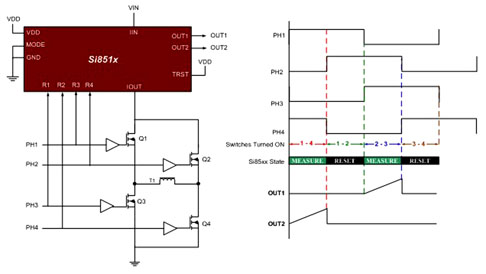 隔离的交流电流传感器,例如Silicon Labs的Si850x/1x器件提供集成的复位电路,高2VP-P的满量程输出信号,测量精度5%,小尺寸和低功耗工作。它们可支持50kHz- 1MHz频率范围(全测量范围为5、10和20Amps),并有1kV和5 kV的额定隔离电压。这些器件具有1.3mΩ低功耗输入阻抗和2nH的串联电感以降低振铃。图4中的电流传感器有“乒乓(Ping-Pong)”的输出模式,来自每个桥臂的电流信号分别传输到各自变压器磁通平衡监控的输出管脚。