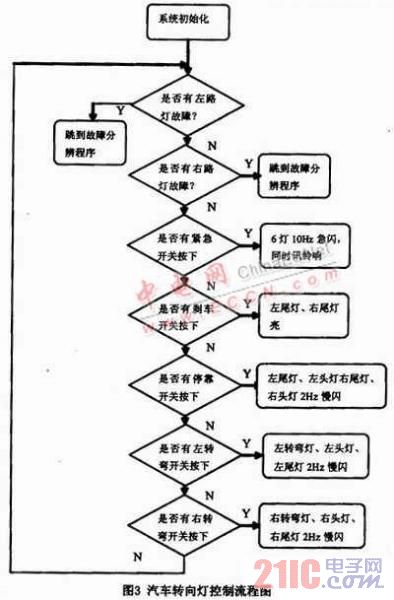 汽车转向灯控制器实际上是根据车灯的状态信息及驾驶员对车灯状态的要求来实现的。车灯的状态信息主要是故障信息的反馈,而驾驶员对车灯状态的要求通过按下不同的开关来实现。具体控制思想如下:在系统启动并进行初始化以后,定时器被启动并周期地对BTS724控制的车灯进行检测,同时亦周期地对车灯开关进行扫描,根据诊断结果和车灯开关,决定灯组怎么显示和是否工作。当有故障发生时,跳到相应的故障分辨程序。在故障分辨程序里分清故障产生的原因,并转去具体处理。与此同时对5个开关进行循环周期扫描,当有紧急开关按下时,左转弯灯、左头灯、左尾灯、右转弯灯、右头灯和右尾灯同时急闪,闪烁频率为10Hz;当按下刹车开关时,左尾灯、右尾灯同时亮;当按下停靠站开关,左头灯、右头灯、左尾灯和右尾灯同时闪烁,闪烁频率为2Hz;当接通左转弯开关,左转弯灯、左头灯、左尾灯同时闪烁;接通右转弯开关,右转弯灯、右头灯、右尾灯同时闪烁,闪烁频率均为2Hz。