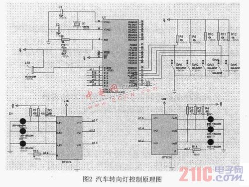 51单片机结构简单,价格便宜,应用广泛,所以本系统采用AT89C5 1单片机作为微控制器。输入信号采用按键开关,连到单片机的P3口上,当人按下某个开关时,把控制命令传给单片机,从而驱动相应的灯组进行工作。输出信号灯在Proteus用LED来代替,这些灯的亮灭由智能功率开关BTS724来控制和检测反馈。BTS724是4通道、低通态电阻的高端开关,内部集成充电泵,兼容CMOS、TTL电平,具有状态反馈功能,用于控制各种标识灯。BTS724带有四通道输入输出,且每一对输入输出相互独立,数字量输出的诊断反馈,在OFF状态(指车灯在未接通的状态下)可检测开路故障,在ON状态(指车灯在接通的状态下)反馈过热关断。对于数字量输出类型的诊断,通过加一个外部上拉电阻到输出,能在负载关闭的情况下检测到开路故障。当按下紧急开关时,不仅6个标识灯急闪而且要同时响铃警示,增强紧张气氛,驱使路人小心避车。响铃在Proteus里用讯响器来代替,发出滴滴声音。根据以上分析,先从元件库里取出元件并在绘图区放好,根据要求设置元件属性,然后连线,完成电气原理图的绘制。对于不在基本库里的元件可以自制,也可以再加库。图2为汽车转向灯控制原理图。