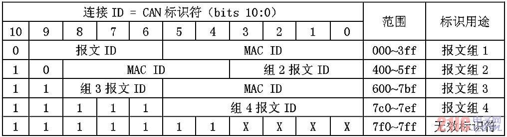 DeviceNet 的标识符分配方案是面向节点的信息标识符分配,对于DeviceNet系统,最多数量为64个的节点,其每一个节点拥有一组出自于3个信息组的标识符,如表1所示。信息组1为每个设备的16个信息提供一高优先信息组,报文ID较小的总是优先发送;信息组2的信息优先权主要取决于节点的号码,信息的MAC- ID可以是目标或源地址该段共计分配512个标识符。信息组3与信息组1结构相似,但提供给每个设备7个标识符优先级比较低,这组的标识符优先权被平均分配到网络上的所有设备。信息组4只有48个标识符,不包含任何设备地址,该组信息主要用于网络管理。由于采用了基本CAN类型的控制器,信息滤波的潜能受到限制,信息组2以这种受到限制的潜能去支持多个设备,因此选择了根据节点号码的滤波功能。即DeviceNet规定了一个预定义主从连接组,以便于观察主-从系统配置的通讯。下面的信道功能是为了向基于预定义连接组的主从设备间的I/O与显式信息的交换提供支持: