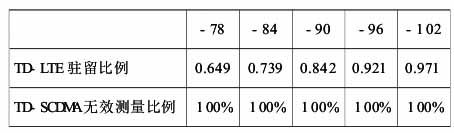 如表 7 所示,采用方案 2 时,分别设置 TD- LTE最低驻留门限参数为 - 78、- 84、- 90、- 96 和 - 102dBm,同样得出 TD- LTE 用户占总用户数的比例以及 TD- SCDMA始终在测量的用户占 TD- SCDMA 总用户数的比例。