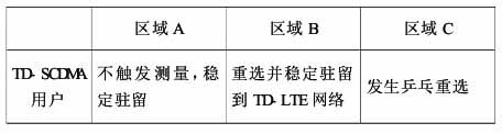 对于区域 C 的 TD- SCDMA 用户,虽然始终周期性对 TD- LTE 进行测量,但由于此时 TD- LTE 的信号值并没有达到驻留标准,因此此时 TD- SCDMA用户并不会发生跨系统重选。从而避免了“乒乓效应”的发生。