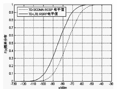 通过仿真也证实这一结论。当这两种制式都不做对边缘用户的优化时,设 TD- LTE 的全带宽(10MHz) 的发射功率为 46 dBm,TD- SCDMA 全带宽(1.28 MHz)发射功率为 33 dBm,双模终端接收信号电平值概率分布如图 1 所示。