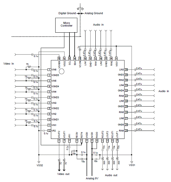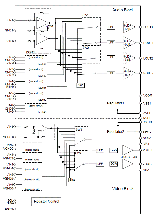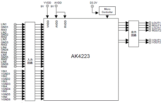 The AK4223 is an AV switch with 6:2 audio and 6:2 video switches. High performances with low power consumption are achieved by CMOS process. Integrated differential input circuits in audio and video blocks can separate the external ground noise. In audio block, a differential input circuit, audio LPF and 0dB/-6dB gain amplifier are integrated eliminating the needs for external LPF for audio outputs. In video block, an input clamp circuit, 6dB amplifier and video driver are integrated, and they also eliminate the need for external circuits. The AK4223 is offered in a space saving small 48-pin LQFP package, ideal for car navigation applications.