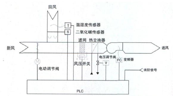另外,要提供一个舒适的环境,除控制室温外,还需对室外温/湿度进行监测,通过室环境温/湿度检测,实时调整空调机和新风机的新风量,进行过渡季节的全新风和空调季节的小新风控制。根据监测环境的CO2浓度自动调节空调机的新/回风混合比,提供长期舒适的活动环境,同时可达到节能效果。