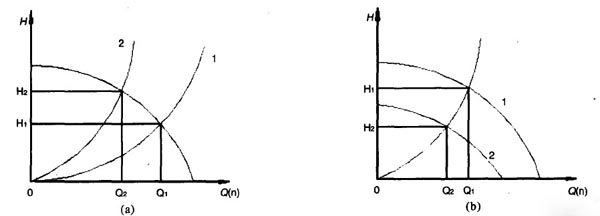 当用蝶阀的开度来控制冷冻、冷却水流量大小时,蝶阀阻管与功率P变化(如图4a所示)由曲线1到曲线2,流量减小,但功率却没有减小多少。若通过调整转速(如图4b所示),H-Q曲线由曲线1到曲线2,蝶阀开度100%时,蝶阀阻力为零,管道阻不变,功率省很多。