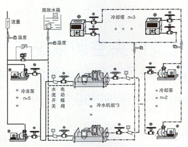 一般冷冻机组控制系统设计方式:在冷水机组的供/回水总管上分别设一个温度传感器(T),在冷冻回水管上设一个流量计(F),同时将此三种信号输入到控制器,经运算可得出大楼的冷负荷Q=F*△T,根据冷机组的效率曲线,经过计算比较,取各种组合中的能耗最小者,并根据设备累计运行时间,进而自动选择冷机的最佳组合。使系统的总能耗保持在最小值,以达到最佳节能的效果。