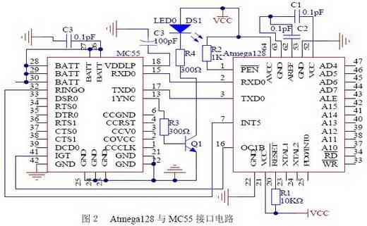 现场各种设备接口电路设计,其中Atmega128与MC55接口电路是该监测系统硬件设计的重点和特色。图2给出以该接口电路为核心的监测站硬件系统电路图。ATmega128L和MC55都有标准的RS232接口,因此硬件设计相对比较简单,只需把Atmega128L的PE5与MC55的 IGT相连,用于启动MC55模块,Atmega128L的TX0/RX0与MC55的TX0/RX0相连,进行数据的输入输出;MC55的RING0接从ATmega128L的中断线,作为数据传输的中断信号。Atmega128是Atmel公司推出的8位高性能单片机,片内具有128KB的程序存储器, 4KB的数据存储器,4KB的EEPROM,有8个10位ADC通道、2个8位和2个16位硬件定时J计数器,8个PWM通道,具有可编程看门狗定时器和片上振荡器、片上模拟比较器、JTAG、UART、SPI,和I2C总线等接口以及六种可以通过软件选择的省电模式。本设计中,ATmega128L是整个数据采集系统核心,主要完成信号的传感器信号采集、软件滤波、数据运算及各种控制功能。M C55是西门子公司生产的GPRS二频模块,它除了具有GSM模块原有的功能外还支持分组业务功能,内嵌了TCP/IP协议;它的数据输入/输出接口实际上是一个串行异步收发器,符合RS232接口标准,且有固定的参数:8位数据位和1位停止位,无校验位。它与 Atmega128协同工作,共同完成数据的远程传输。