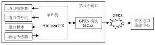 磁电传感器安装在距道口500 m左右处,当它检测到来车信号后,通过铜轴电缆将信号传送至道口自动控制箱内的单片机Atmega128。MC55是信号发送的主要设备,它将单片机采集到的数据打包后通过GPRS网络传输到矿区道口监控中心,由道口监控中心对数据做进一步的分析处理。