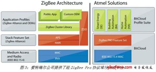 为实现这一目的,爱特梅尔公司提供了经ZigBee Pro协议堆栈认证平台,并支持各种公共应用规范。开发人员可通过包含ZigBee Smart Energy、ZigBee Home Automation以及ZigBee Building Automation标准设备支持的BitCloud Profile Suite获得这些产品。爱特梅尔公司最近发布的RF4CE协议堆栈套件RF4Control可让开发人员实现支持最新ZigBee Remote Control规范的ZigBee遥控设备(图3)。