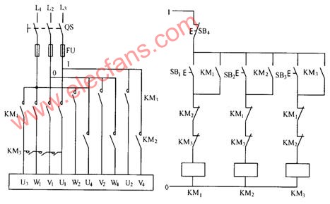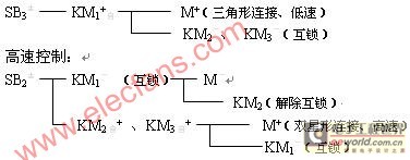 显然,这套线路任何一种速度要转换到另一种速度时,必须先按下停止按钮,因为三个接触器之间是电气互锁的。