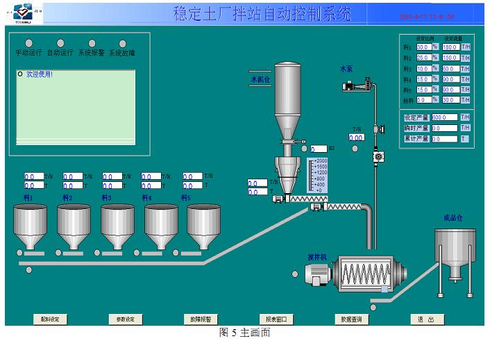 基于以上基本原则和要求,本课题以 WinCC 为开发平台,对稳定土厂拌站自动控制系统的上位机监控组态程序进行了设计开发。本系统设计的上位机监控界面的主画面如图 5所示。