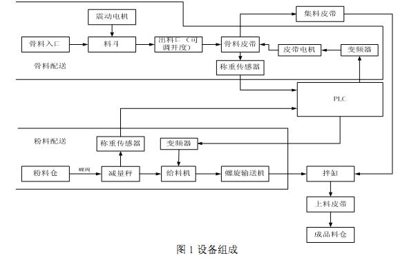 稳定土厂拌设备主要由计算机自动控制系统、粉料配送系统、骨料配送系统、集料皮带、搅拌装置和成品料输送储存系统等几部分组成。其中有一套粉料配送系统,五套骨料配送系统。除此之外,还有供水系统、供气设备和上料装置等。 如图1所示
