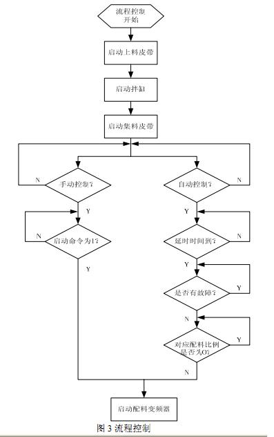 流程控制部分分为手动和自动控制两种方式。在按顺序启动上料皮带、拌缸、集料皮带之后,操作者可以通过自动或手动的方式来启动后续流程设备。在生产流程中自动控制和手动控制的主要区别在于: 自动控制过程中五种骨料和粉料的配料变频器由程序自动来控制启停和调节其输出频率, 不需要人工干预; 而手动控制模式下人工可随意启停各个配料变频器,并且可以手动调节各个变频器的输出频率。配料变频器的启动与停止是有固定的顺序的,各个变频器的启停之间有一定的时间间隔, 该时间间隔可以在上位机监控画面的参数设定部分进行设定和调整。另外,还有一些相关的设备如空压机、电铃、成品料仓仓门等设备需要人工来启动。