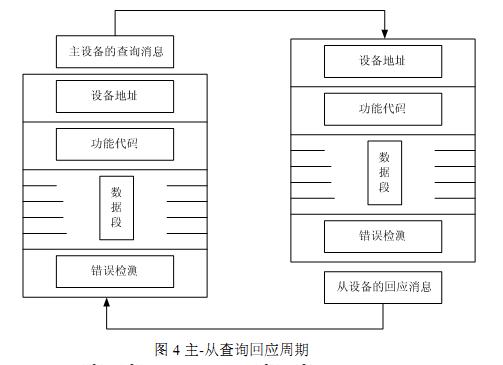 本系统采用PLC与变频器进行通讯的方式来实现PLC对变频器的启停控制和频率设定以及读取变频的一系列运行数据。PLC 与变频器之间采用 Modbus RTU 方式通讯,波特率设为 9.6K,采用CRC 校验。在 RTU 模式下,消息发送至少要以 3.5个字符时间的停顿间隔开始,程序中以 10ms为间隔进行数据的发送与接收。PLC 和变频器采用主从的方式进行通讯,PLC 是主机,变频器是从机。一共有六台变频器,在其参数设置中将其地址设为 1-6号。PLC 与变频器之间的通讯是一个“查询-回应”的过程,如图 4 所示。