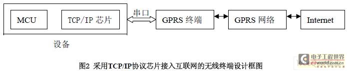 本设计方案不需要外加TCP/IP协议转换芯片,所以硬件体积小,成本少。但是开发时间长,需要做大规模的软件上的工作(比如操作系统的嵌入、TCP/IP协议栈、PPP协议的处理等都需要在一个处理器中完成),对开发者要求很高。另外还要做大量的测试。 基于以上两种方案,GPRS终端相当于Modem,用于连接设备和Internet网络。利用GPRS网络与分组数据网络互联互通的特性,实现了将设备接入最大的PDN网络Internet。设备与GPRS终端之间采用串行接口通讯,在GPRS终端连接上网络后,设备即可以通过其来实现与Internet上的主机进行数据通讯,GPRS终端透明收发数据。这种实现方法类似于使用家用PC做代理接入的方式,只是这里采用了无线方式,网关改为GPRS终端。