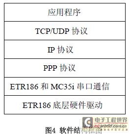 基于GSM/GPRS的无线数据传输模块设计的目的是为无线网络通信应用提供一个简单实用的平台,须在模块内嵌TCP/IP协议栈,实现了数据在用户终端和服务器之间的透明传输,使用户可以方便地应用,实现远程的无线数据传输。无线数据传输模块的软件结构框图如图4所示。