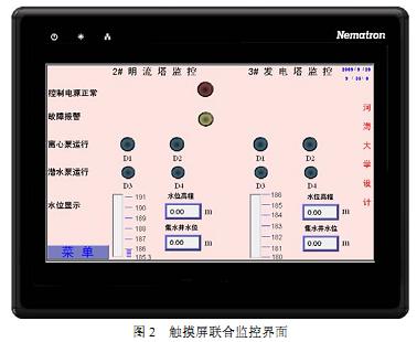 本系统的监控部分包括:两路电源的供电情况;2#明流塔和 3#发电塔的水位高程及集水井水位信息;所有电气设备原件如两塔潜水泵、离心泵、电动阀、电磁阀等动作情况;正常时水流量及启泵后排水量的监控等。