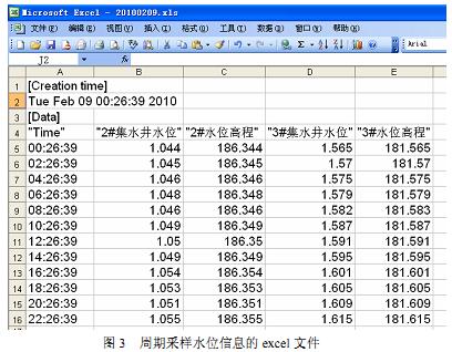 触摸屏在对信息采样的同时,便将这些信息保存在自己内部寄存器中,工作人员可以查询 180 天以内的所有水位信息和动作信息。也可直接用 U 盘下载采集到的保存在触摸屏内的水位信息的历史数据及历史动作,利用相应软件,将下载数据转换成excel文件,便于工作人员进行研究分析,也便于将资料归档整理。如图 3、图 4所示。
