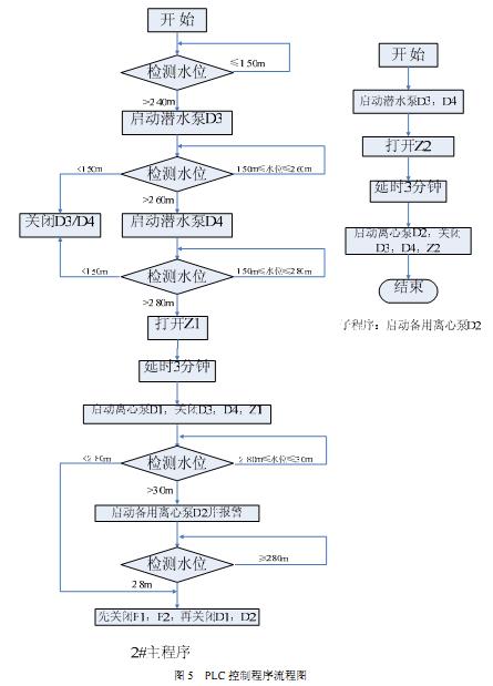 本系统下位机软件采用 Windows操作系统下的VersaPro2.0进行编程调试工作,该编程软件拥有良好的人机操作界面,编程简单易行,便于用户的调试、维修、改造等工作。软件由主程序和六个子程序构成,主程序用于系统初始化、数据处理、通讯、报警输出和调用子程序等; 六个子程序分别用于对两个泵房的设备进行自动控制、 手动控制和触摸屏手动控制。软件流程图如图 5 所示,其中水位高度为集水井水位高度。
