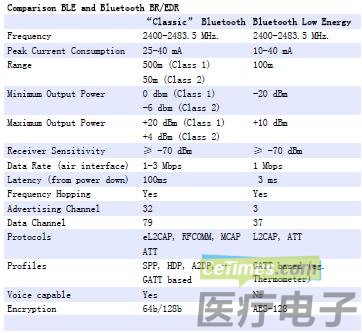 低功耗蓝牙主要应用于医疗和健康传感器网络等电源供给有限的场合。下图为低功耗蓝牙和普通蓝牙的指标比较。
