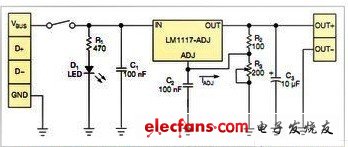 ,还可以获得1.25V?3.75V的电压,大多数电路都使用这个范围。图1中的电路就覆盖了这个区间。通过R3可改变这个区间,如下式所示:VOUT=1.25V×(1+R3/R2)。式中的1.25V出现的原因是LM1117-ADJ 能在VOUT与ADJ(调节)管脚之间产生1.25V。因此, 电阻R2有一个恒定的电流通过电阻R3;IADJ(调节的电流)通常小到可以忽略不计。R2选择为100Ω,将其电流设为12.5