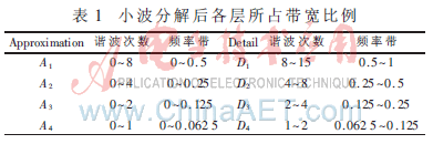 以4层分析为例:各层小波分解可看成是带通或低通滤波器,若将整个信号所含最高频率看作1,则每层所占具体带宽如表1所示[5]。