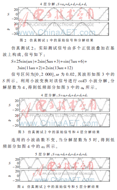 仿真测试1:测试信号由一个正弦波叠加在基波上构成:S=25sin(ωx)+2sin(13ωx+12),如图2中的S所示,信号区间为[0,1 000],ω为0.02,在Matlab中,利用小波变换对信号进行coif3分解,4层分解后得到低频部分如图2中a4所示。