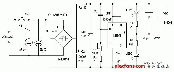 这时电源通过电容器C3 、电位器RP、电阻器R3至“地”,对C3进行充电,随着C3上的电压升高,NE555的②、⑥脚的电压越来越往下降,当此电 压下降至2/3VCC 时,NE555的③脚输出由低电平跳变为高电平,这时继电器将失电而不工作,则其控制触点恢复原位,则“延关”插座失电,而“延 开”插座得电。就这样满足了不同的需求,LED、LED2作相应的指示。
