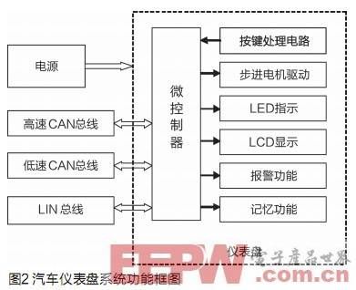 根据以上要求,本文设计的汽车仪表盘节点由MCU系统、步进电机驱动、LED显示、LCD显示、报警功能、记忆功能、按键处理、LIN总线通信、高速CAN通信、低速容错CAN总线通信以及电源供给等几个方面构成(图2)。