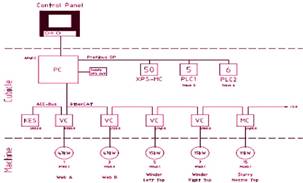 根据分析maxedge线锯驱动系统硬件大致由2个kes120模块、8个kw模块(分别控制4个绕线轮、4个导轮)、3个kwd模块(分别控制左上、下排线轮,右上、下排线轮,上下工作台)和伺服电机组成。控制面板和plc1、plc2以及安全继电器xps-mc之间采用profibus通信。驱动控制系统框图如图2所示。