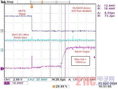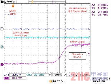 (图字:MUTE信号,20mV偏移开关输入,开关输出,ISL54405器件软启动开启,转换速率=3.5V/μs)