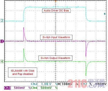(图字:音频驱动器DC偏压,开关输入波形,开关输出波形,ISL54406具有杂讯和破音禁用功能)