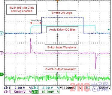 (图字:ISL54406具有杂讯和破音功能,100ms延迟,开关逻辑,音频驱动器DC偏压,开关输入波形,开关输出波形)