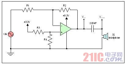 图2显示了一个简化布局的驱动一个32Ω耳机的单电源音频放大器,它广泛用于许多便携式媒体播放器。音频放大器的输出信号DC偏置在系统电源电压的一半,允许在正负方向的完整的音频信号摆幅。220μF隔直流(DC blocking)电容可消除耳机负载的DC偏置。220μF电容和32Ω负载阻抗构成了一个有22Hz转角频率的高通滤波器(HPF),可覆盖整个音频带宽。