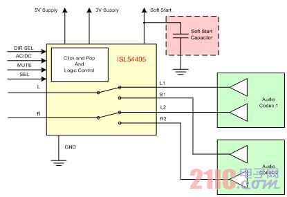Intersil公司在Switch/MUX产品线中采用了不同的技术来消除杂讯和破音。选择使用哪种技术是由一个必要的隔直流电容决定的。下面一节描述了以Intersil的模拟开关实现的两种技术。