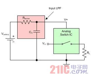 在IC的Vbattery电源引脚和V+引脚之间放上一个串联电阻RSeries,就构成了一个带有去耦电容Cin 的低通滤波器(LPF)。由于Intersil的音频开关IC消耗的电源电流≤10μA,这个解决方案很有效,在大小适当时,可以使串联电阻两端的电压降忽略不计。这个LPF可将DC电压的快转换速率瞬变转换成IC电源引脚上较慢的指数斜率。较慢的斜坡电压可以最大限度地减少电源的开关瞬变,同时消除开关输出端所有的注入电荷,这些电荷会导致负载上的杂讯和破音。