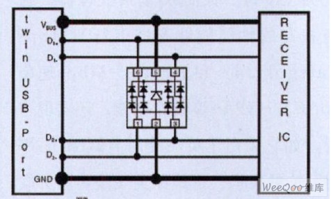 图2 VBUS054B 一HS3总线端口保护阵列可保护高速USB端口" title="USB端口">USB端口, 以防瞬态电压信号