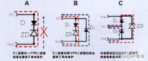 Z 二极管与小型P N 二极管的这种结合提供了单向保护器件。钳位电流只能朝一个方向流动, 如图l所示。添加另一个P N 二极管可打开反向通道, 从而使该保护器件实现双向保护。当正向和反向的钳位电压电平