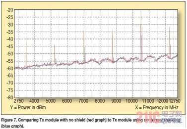 图中显示的是发自RF3282 TxM的辐射功率。红色图表示没有屏蔽的TxM,蓝色图表示的是采用MicroShield屏蔽的TxM。注意:为更清楚地显示两种被测器件的差异,蓝色图被稍微右移。如图所示,MicroShield集成RF屏蔽显著降低了辐射功率。在10.5GHz仅有一个示警。它昭示着这两种情况:或是存在另一种模式(腔模式),或是结果也许与流经屏蔽表面的地电流相关。但无论如何,对辐射功率的平均衰减可达15dB或更高。