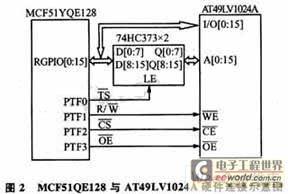 图2为QE128与AT491LV1024A的硬件连接实例。在本实例中,锁存器使用的是2片TI公司的8路D型锁存器74HC373.2片74HC373的锁存使能LE(Latch Enable)引脚相连,通过QE128的TE信号控制来选择地址总线和数据总线。